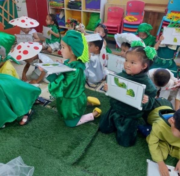 Ахлах бүлэг "Алтан намар" өглөөлгөөр дамжуулан хүнсний нарийн ногоо болох цагаан лууван, юуцай, цэцэгт байцаа, мөөг зэргийг өдөр тутам хоол хүнсэндээ хэрэглэснээр бидний биеийг амин дэмээр хангаж өсөлт, хөгжилд нөлөөлдөг болохыг жүжигчилсэн тоглолт болон puzzal эвлүүлэх тоглоомын аргаар таниулж ач холбогдлыг нь хүүхэд өөрөө мэдлэг бүтээж байгаагаар онцлог байлаа. Хүүхэд бүр өөр өөрийн дүрд хувиран жүжигчлэн тоглож дүрдээ орж байгаа нь эгдүүтэй.